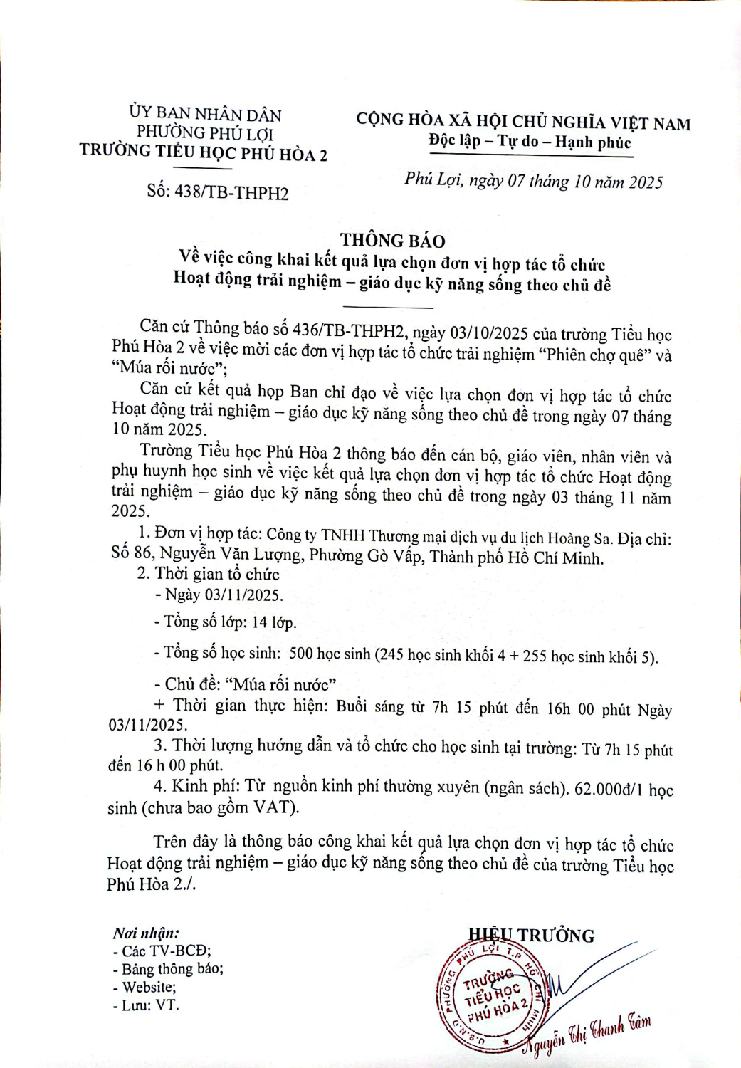 Thông báo công khai kết quả lựa chọn đơn vị hợp tác tổ chức hoạt động trải nghiệm - giáo dục kĩ năng sống